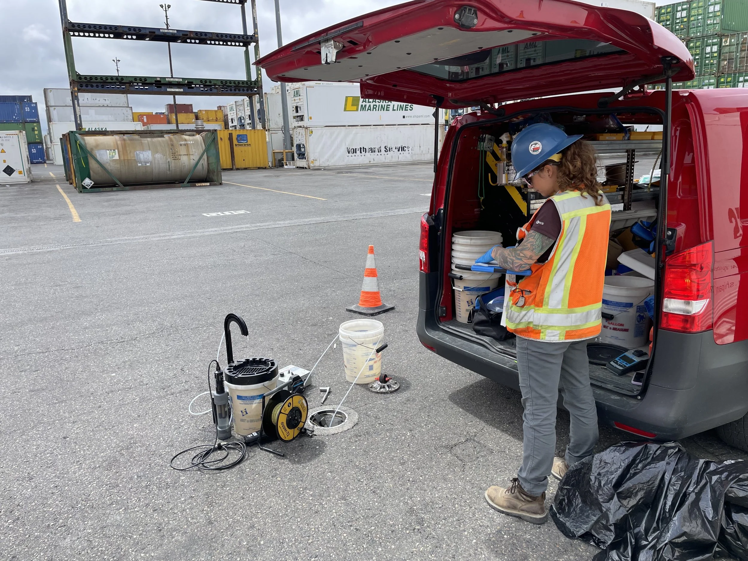 • In 2024, the project team conducted fieldwork to test for contamination. Crews collected soil samples by driving hollow rods into the ground with a drill machine. Samples were taken from the removed soil to test for contamination at different depths. Groundwater monitoring wells were installed using a sonic drill and water was pumped out for sampling. The fieldwork team advanced 96 soil borings and 42 groundwater monitoring wells.